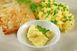 Kada su jaja gotova, sklonite sa ringle, dodajte kašiku pavlake (koja će smanjiti temperaturu jaja) i tek onda dodajte so i biber. Mešajte još 30-ak sekundi, uz dodavanje vlašca i peršuna. Bond je voleo ova jaja servirana na tostu od integralnih žitarica, koji je premazan puterom, uz roze šampanjac (Taittinger) i tihu muziku. Deo Bondovog doručka, bile su i 2 jake i gorke crne kafe, a preferirao je proizvode sa Jamajke.
