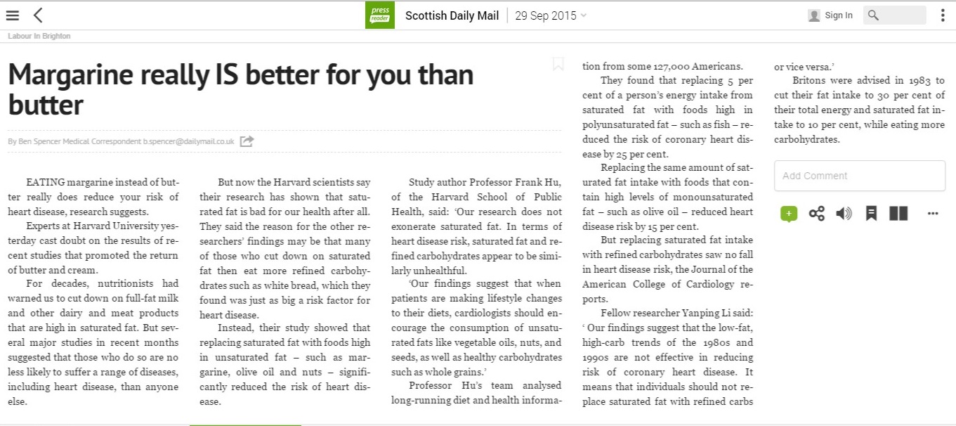 Originalno, pominjanje margarina i njegovo povezivanje sa istraživanjem sa Harvarda nije bilo maslo domaćih medija.