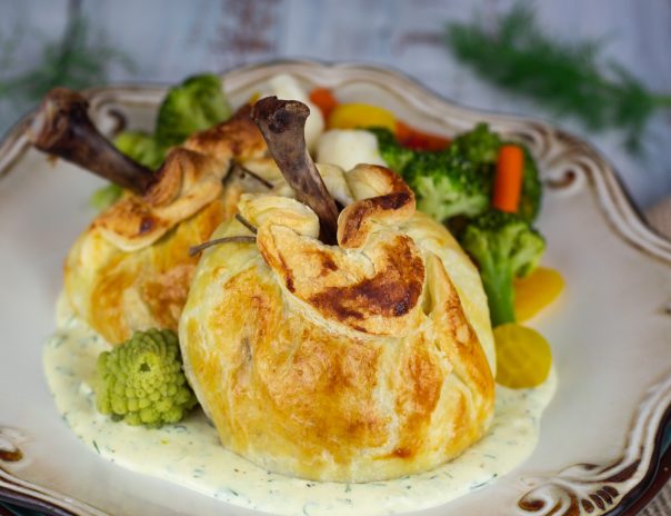 Kad je vreme za pečenje, razvijte lisnato testo i iz njega isecite 4 kvadrata ili “blaga” pravougaonika. Na sredinu svakog komada testa stavite po 1/4 fila i malo razmažite, ali ne baš do ivica. Spustite batak tako da najdeblji deo batka bude na sredini testa, a kost da “gleda u plafon” 🙂 Zatim rukom pokupite ivice testa i složite ih ka kosti u paketić. Ivice testa malo zavrtite u krug oko koske, da se zalepe – ili jednostavno upotrebite kanap i vežite ivice.