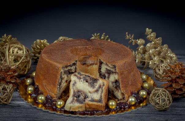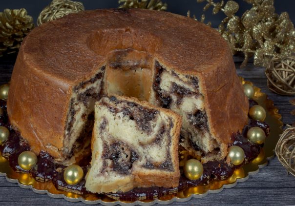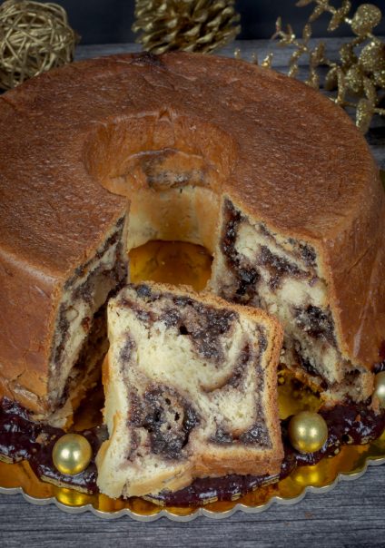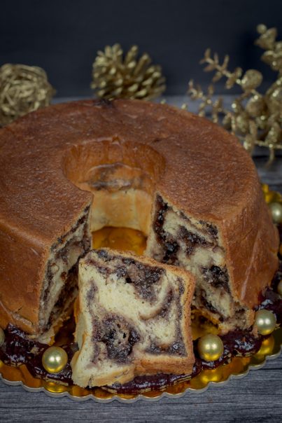 Za pečenje je korišćen kalup koji liči na kalup za kuglof, samo ima ravne ivice. On je prečnika 23-24 cm i dubine oko 10 cm. Možete da koristite i kalup za kuglof sličnih dimenzija, ali ćete njega teže obložiti papirom za pečenje – što je to bio razlog da odaberem ravne ivice.