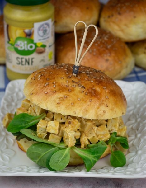 Iseckajte tofu na kockice. U činiji izmešajte francuski dresing za salate, nutritivni kvasac, senf, kari, so i biber. Probajte dresing, i ako ste zadovoljni začinima – jednostavno umešajte tofu. Salatu servirajte uz zeleniše u burger-lepinji.