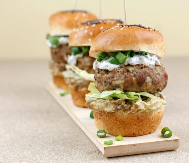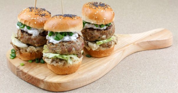 Po želji, na istom tignju malo zapecite lepinjice (ne mora). Zatim na donju polovinu stavite 1-2 kašike Ribella hummus sweet onion salad namaza. Pa na njega složite seckanu zelenu salatu. Zatim ide malčice prohlađen burger. Pa Tzatziki sos. I na kraju perca mladog luka i gornja polovina lepinjice.