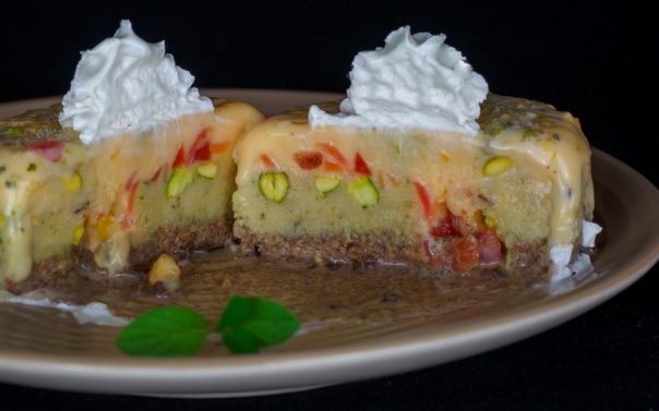 - U drugi deo dodajte seckani pistaći i po želji malo matcha čaja ili zelene prehrambene boje.