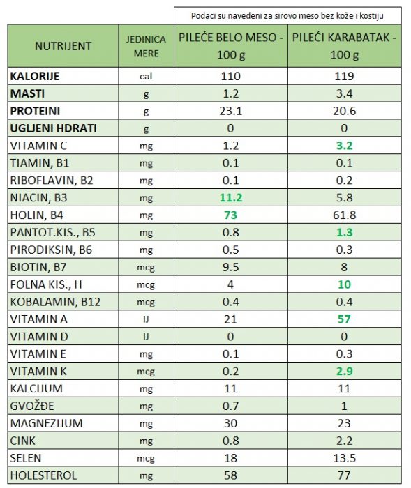 Što se tiče onoga da je belo meso zdravije, hajde da pogledamo tabelu i utvrdimo kako stvarno stoje stvari. Istražujemo samo situaciju ako oba jedemo bez kože. A posle ćemo videti da li je koža problem…