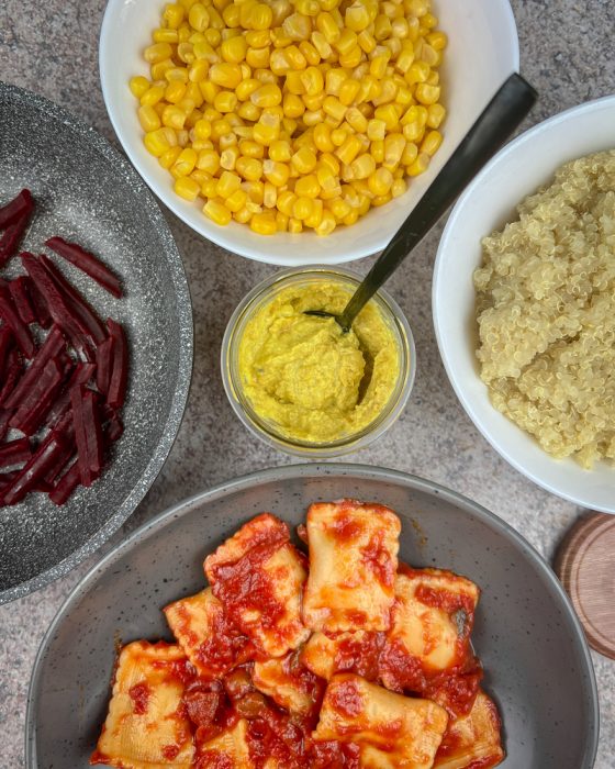 - kinoa, ravioli u paradajz sosu, kukuruz, cvekla & namaz od žute paprike