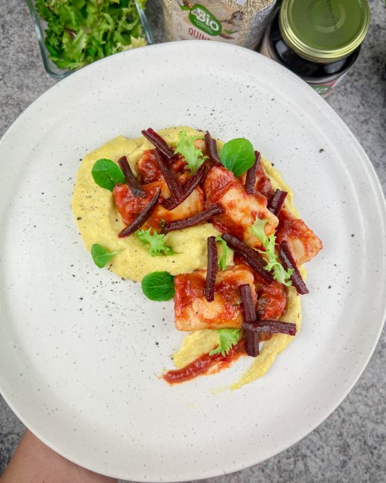 Prirodno blago slatkasti pire je bio obogaćen aromicama iz namaza, što se pokazalo kao prilično dobra ideja. Kada su tome dodate raviole u kiselkastom paradajz sosu – ono što je nedostajalo u kombinaciji je bila samo ljutina. Ona je postignuta začinjenom cveklom.