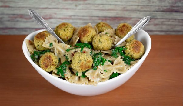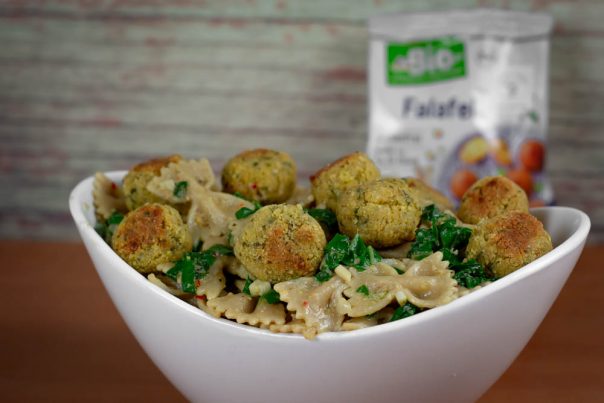Za serviranje: propržiti spanać ili naseckanu blitvu na preostalom ulju, dodajte skuvanu testeninu – a zatim i sos. Dobro izmešajte pa servirajte ukrašeno pečenim falafelom.
