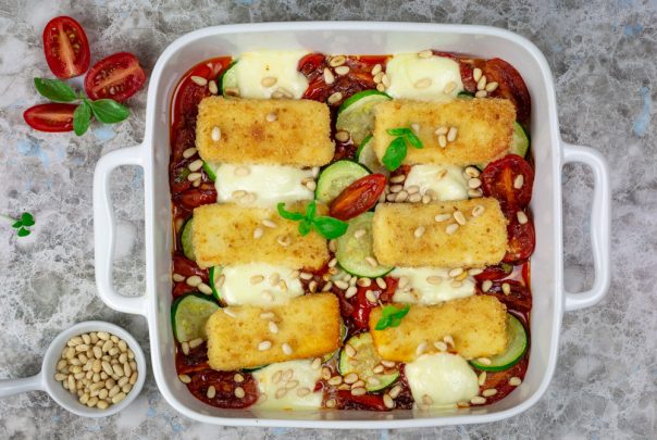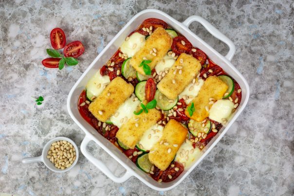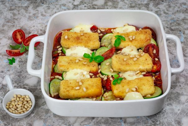 Podmažite keramički pekač ili vatrostalnu posudu s malo maslinovog ulja. Naređajte naizmenično paradajz i tikvice. Preko poređajte komade halumija, a „praznine“ popunite mocarelom. Zapecite tek da se mocarela otopi i servirajte toplo, posuto pinjolama.