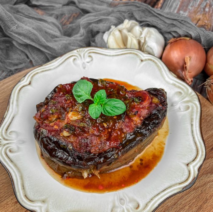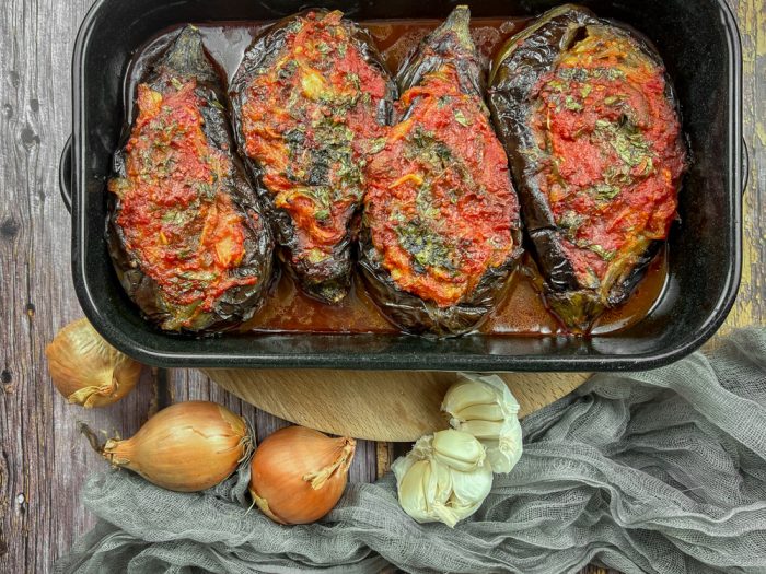 Plavi patlidžan se stavi u posudu za pečenje i raseče na pola – ali ne do kraja. Tek da se napravi „džep“ koji se puni isprženim povrćem. Ostatak tečnosti i povrća se malo izgnječi ili izblenda, pa prelije preko punjenih patlidžana.