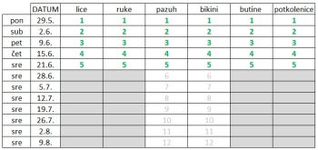 Upravo zato, kako sam kupila aparat krajem maja, nepravila sam sebi plan i raspored tretmana u tabelici. Donela sam odluku da ću se sunčati tek od 28. juna, kada nastavljam da radim samo pazuh i bikini – tj. mesta do kojih sunce teže stiže 🙂 Primetićete u tabeli da sam pomerala tretman za dan ili dva – pa umesto da radim na 7 dana, radila sam nakon 5 ili 6. Samo zato što je leto bilo na pragu i htela sam da požurim.