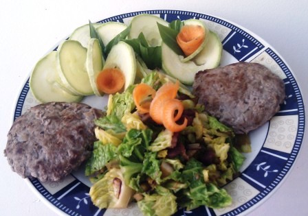 Pljeskavice od mlevenog telećeg buta sam spremila pre par dana, nekoliko paketića i zamrzla. Izvadila sam ih iz friza jutros kada sam pošla na posao. Kelj je bio u frižideru, opran i očišćen. Isto kao i praziluk, sremuš, tikvica i šargarepa. Još jedna ušteda vremena!