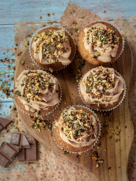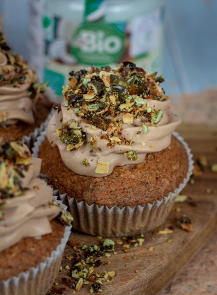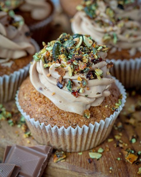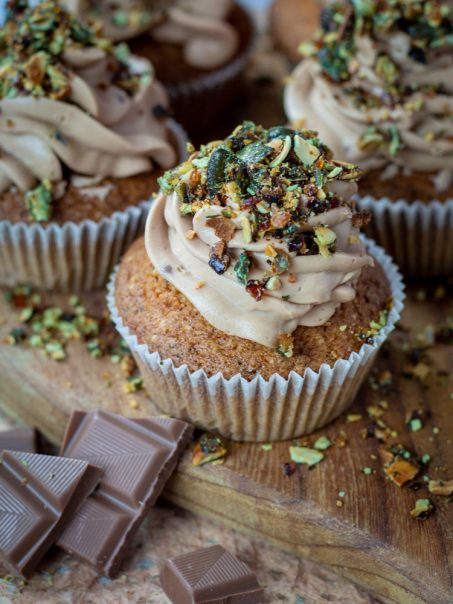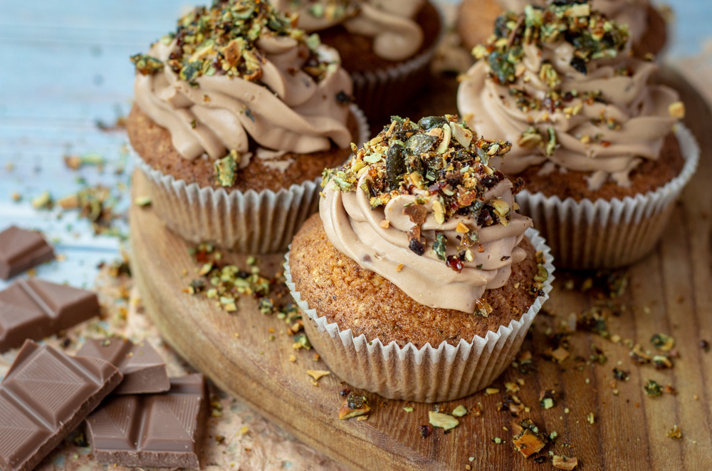 Na prohlađene mafine, špricem za dekorisanje, rasporedite fil. Zatim sve pospite izmrvljenom pralinom od semenki bundeve. Vratite u frižider da se cupcake još malo ohladi.