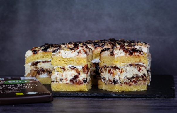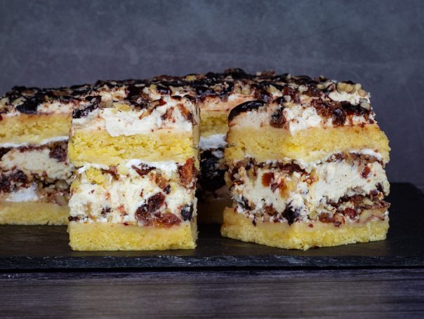 Kolač je veoma interesantan, a rekla bih – i jak. Do sada nisam ni probala, ni pravila ništa slično. Sačinjen je od prhkog testa, premazanog masom za puslicu i posutog suvim voćem i lešnicima – da bi sve spojio krem od vanile, mleka i maslaca.