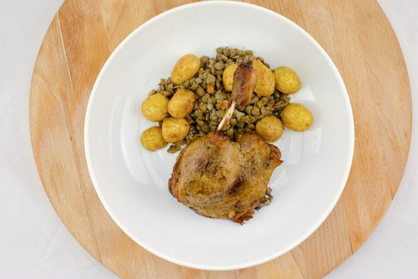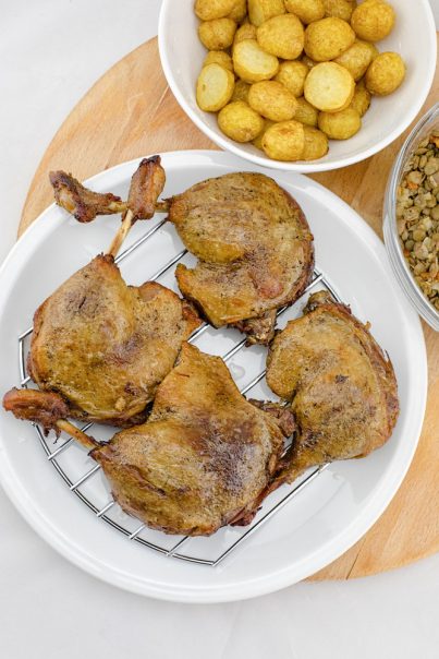 Konfitirana pačetina se, po pravilu, servira sa sočivom i pireom od krompira sa belim lukom. Kako je počela sezona mladih krompirića, bilo mi je nerazumno da pravim pire, umesto da poslužim njih…