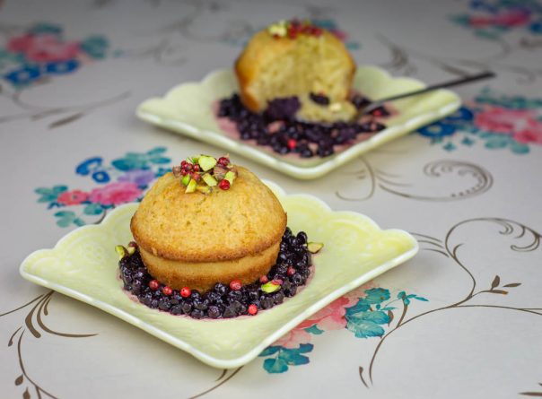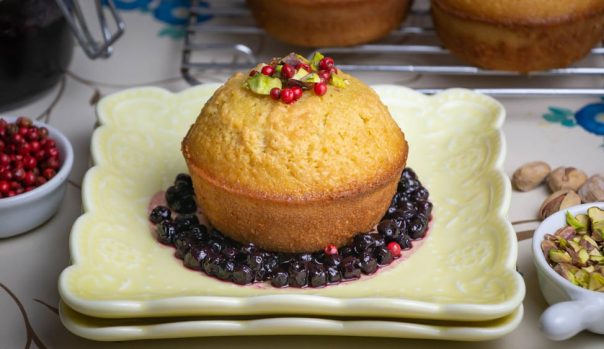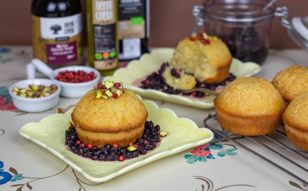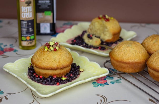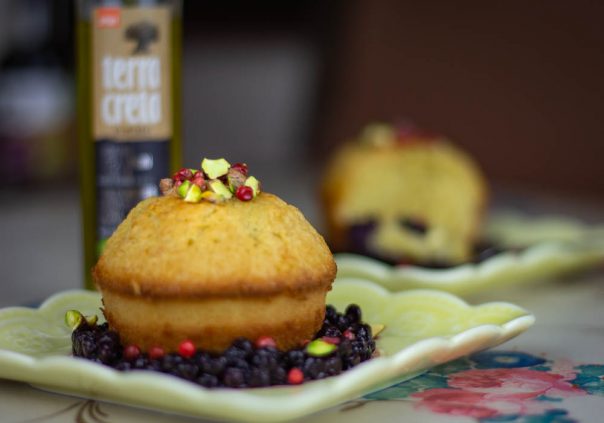 Izmešajte prašak za pecivo i brašno. Odvojeno umutite jaja sa šećerom i mlekom. Dodajte Terra Creta ekstradevičansko maslinovo ulje i dobro izmešajte (nije neophodan miskser). Umešajte na kraju i brašno. Pecite kao kolač ili mafine, na 160 stepeni oko 30-35 minuta. Servirajte kolač uz preliv od borovnica, crveni biber i po želji, pistaći.