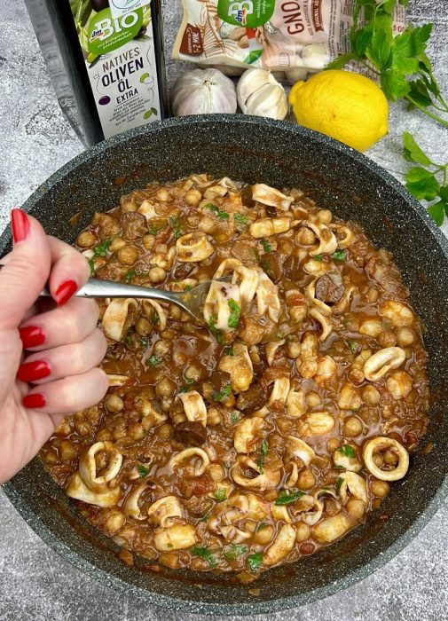 I treća napomena jeste da pipke lignji ostavite sa strane i kratko bacite na gril tiganj. Biće super za ukrašavanje jela. Čak možete s njima sutra da napravite neku zdravu obrok-salatu. Naravno, mogu da idu i u gulaš, samo vam dajem dodatne idejice 🙂