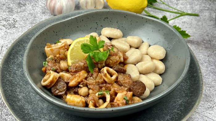 Kad je sos gotov, ubacite lignje i gambore. Dobro ih umešajte da budu potpuno u sosu i kuvajte još 5 minuta. Ovim morskim plodovima će to biti dovoljno. Na samom kraju kuvanja – korigujte začine, ubacite sitno iseckan peršun i sok limuna. Servirajte sa skuvanim njokama i odmah poslužite.