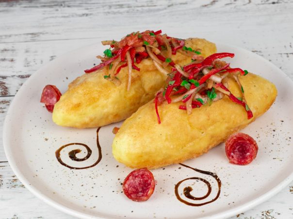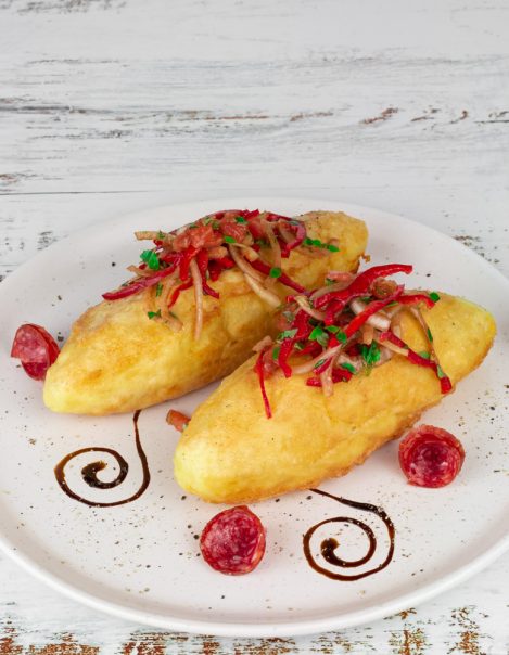 Danas je na jelovniku “ćirilizovan” specijalitet iz Perua – Papa Rellena. U ovom najprepoznatiljivijem latinoameričkom kroketu kao fil najčešće se koristi mleveno meso obogaćeno kuvanim jajima, suvim grožđem i crnim maslinama. Nisu nepoznate ni vegetarijanske varijante s plavim paradajzom ili pečurkama. Ovaj put, za fil ću upotrebiti jednu namirnicu koju mi tradicionalno koristimo za meze i jednu koju koristimo za glavno jelo: čajnu kobasicu “Zlatiborac” i belo pileće meso.