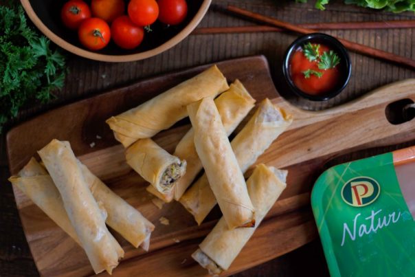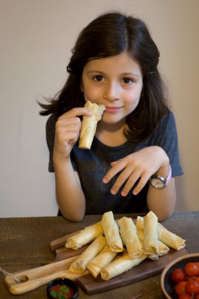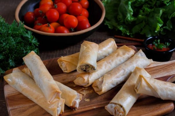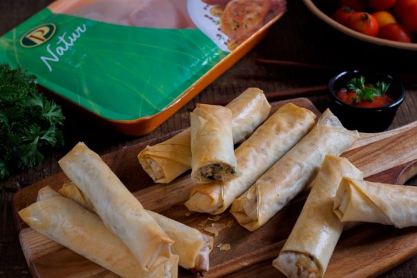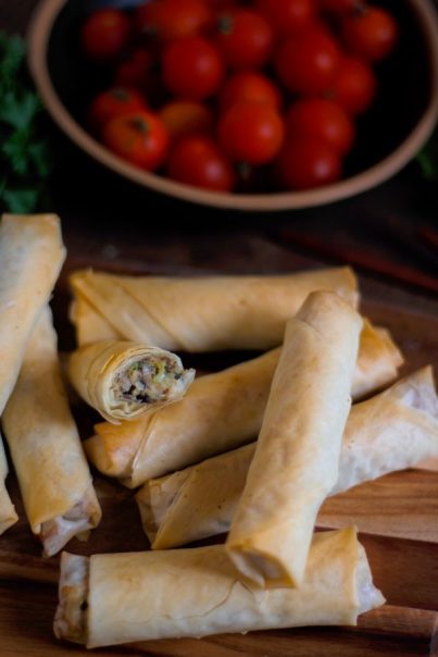 Odvojite lepo kore iz paketa, pa svaku presavijte na pola tako da dobijete pravougaonik i premažite ga maslacem. Zatim pravougaonik isecite na pola da dobijete dva kvadrata. Svaki kvadrat nafilujte punom kašikom fila i smotajte kao klasične vijetnamske “spring rolls” (evo fotografije kako se to radi).