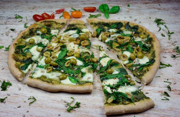 Na testo koje ste razvukli stavite pesto od bosiljka (1 ili 2 cm od ivica nemojte da mažete kako bi ivice više narasle). Iseckajte mocarelu na tanke trakice nožem i vratite je u frižider. Pripremite ostale sastojke za fil (spanać, masline, papriku). Neka pica odstoji oko 1 sat.