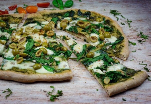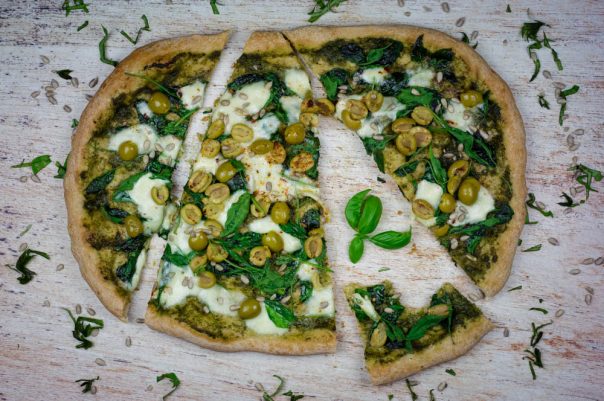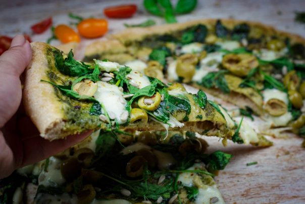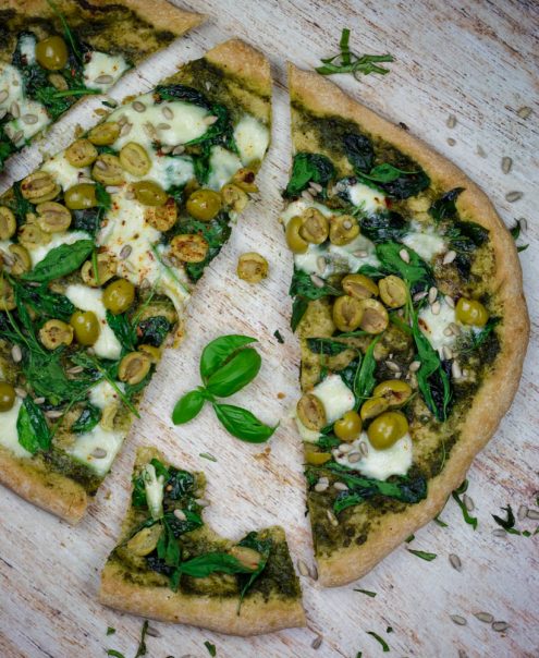 Pecite pizzu 6-7 minuta. Kada vidite a je gotova, tek tada smete da otvorite rernu. Izvadite i brzo nafilujte ostalim sastojcima (redom: spanać, mocarela, masline, paprika). Pecite još oko 2 minuta dok se sir ne rastopi i zvadite je iz rerne. Na gotovu picu, naseckajte makazama svež bosiljak, poprskajte maslinovim uljem i pospite malo suvo pečenih suncokretovih semenki.