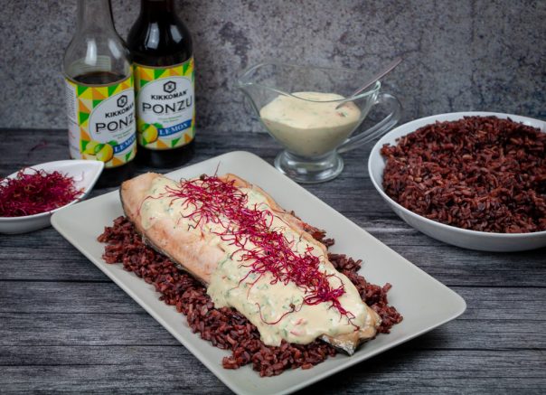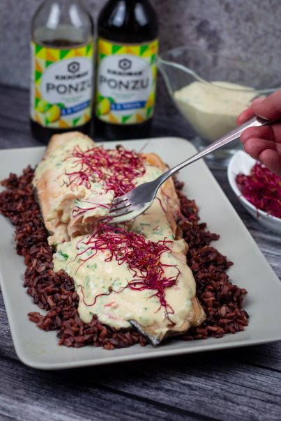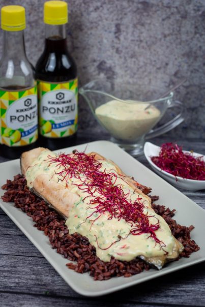 Jelo se servira uz skuvani pirinač – ja sam se ovaj put odlučila za mešavinu crvenog i crnog pirinča, ali možete bilo koji. Preko se sipa kremasti sos i ukrasi mikrobiljem. Ja sam koristila klice cvekle ovaj put. A za intenzivniji ukus jela i više umamija – možete i u pirinač da stavite koju kap Kikkoman Ponzu sosa 🙂