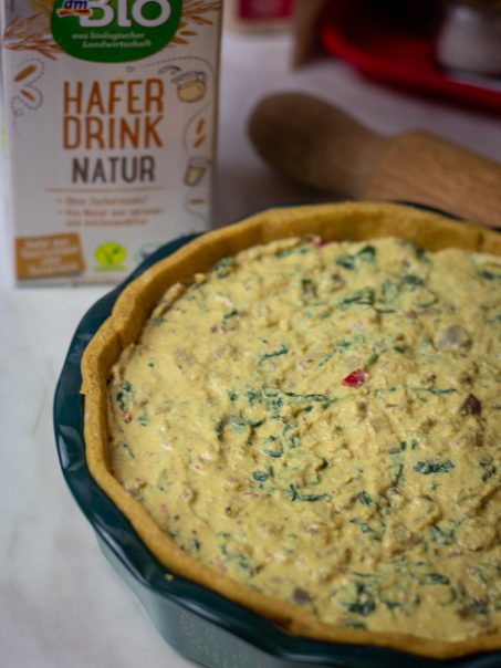 U blenderu izmešajte tofu, napitak od ovsa i sok limuna. Izblendajte sve da dobijete glatku masu i po potrebi dodajte još neku kašiku napitka od ovsa. Treba da se dobije gladak krem, koji po gustini podseća na krem-sir. Dodajte mu nutritivni kvasac, brašno, so, kurkumu, biber i bosiljak – pa umutite još malo. Spojite krem s pečurkama & spanaćem. Sipajte preko polupečene kore i ispecite do kraja (kao što je gore objašnjeno). Služi se toplo, kad se prohladi.