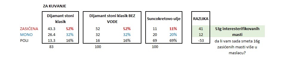 Ako znamo koliko ima zasićenih masti, sada bi trebalo da nas zanima koliko ima i onih drugih – interesterifikovanih. Morala sam da koristim podatke za margarin bez vode, jer su podaci za ulje bili bez vode.