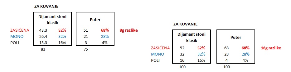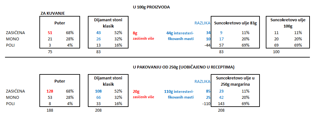 - Na 100g proizvoda imate 8g zasićenih masti više u maslacu – ali 44g masti na kojima je “intervenisano” u margarinu