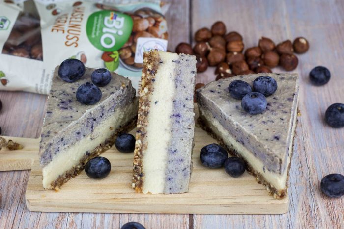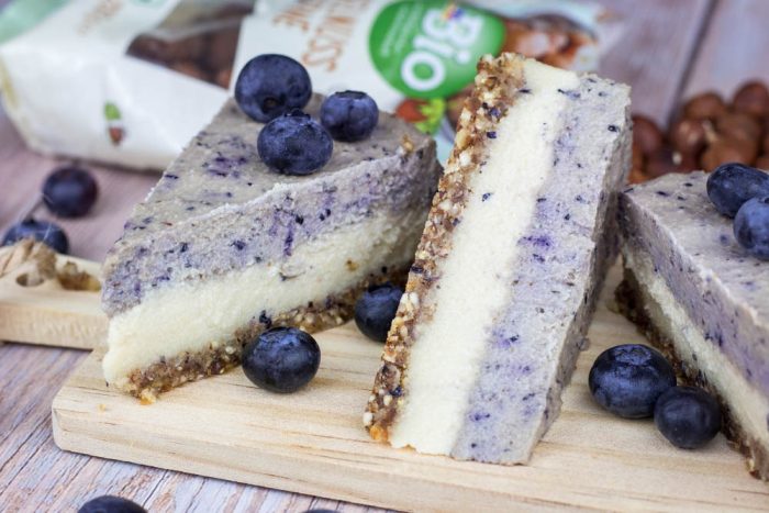 Za krem: u secka ubacite sve sastojke sem borovnica – oceđen indijski orah, javorov sirup, bademovo mleko i prethodno otopljeno kokosovo ulje. Sameljite ih u fini krem i nešto malo više od polovine krema sipajte preko baze od lešnika. Ponovo vratite u frižider. U ostatak krema koji je u secku, dodajte borovnice, pa ponovo sameljite. Kada se svetli krem od indijskih oraha malo stegne, preko njega sipajte krem od borovnica i pažljivo ga rasporedite, kako se dve boje ne bi izmešale. Dobro ohladite u frižideru – a idealno je da poslužite tek sutradan.