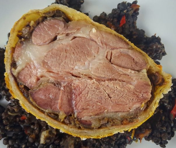 Spremila sam jedno jelo. Radi se o vratu Iberiko praseta i meso je pripremljeno kuvanjem u vakuumu. Namazano je mešavinom: prženog crvenog luka, zaslađenog kesten-pirea, guščije džigerice, lisičarki i vrganja. Umotano je u pancetu, pa u lisnato testo i ispečeno.