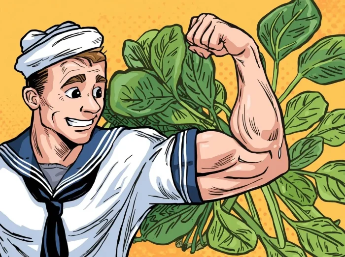 Nakon toga, negde oko 1930. pojavio se strip i crtani junak Popaj – i štamparska greška je nastavila da se širi dalje, kao epidemija. Ne samo da su deci pričali da jedu spanać zbog gvožđa, već i da bi imali mišiće. Nema veze što spanać ima samo 2.9 g proteina na 100 g sirove namirnice – ljudi su ga gledali kao nešto što je presudno za „mišićno-građevinske“ radove u telu.