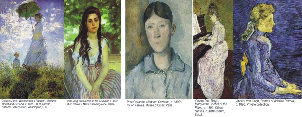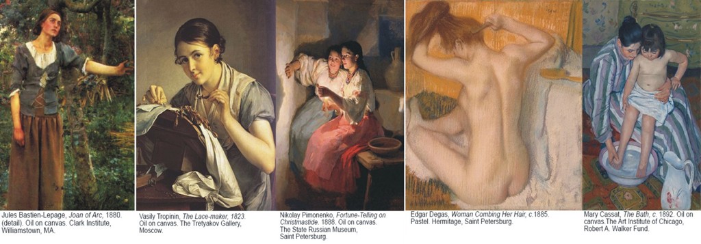 Bastien-Lepag slika Jovanku Orleanku kao realnu i dramatičnu figuru sa trnjem, istrošenom odećom i licem i rukama obeleženim teškim radom. Tropnin nam daje šarmantno platno na kome je skromna i iskrena devojka koja izrađuje čipku. Pimonenko majstorski oslikava izuzetnu scenu sa dve mlade devojke koje proriču sudbinu, dok Dega nežno kreira intimnu scenu žene koja češlja svoju kosu . Kasat s ljubavlju slika majčinsku privrženost, brigu i pažnju.