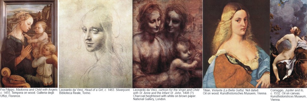 Da Vinčijevu genijalnost ne treba posebno objašnjavati jer je njegova sposobnost da kreira slike koje gledaoca privlače u njegov svet neprevaziđena. Mona Liza nije njegova jedina hipnotišuća devojka. Ticijan je vešto utkao i psihološku komponentu u svoje portrete, dok je Koređo majstor senzualnosti.