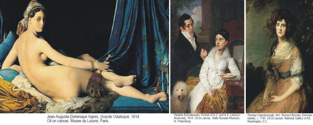 Ranih 1800-tih svet postaje romantičniji a iz tog vremena ostaju slike kao dokaz. Žene su stilizovanije, razigranije i ljupkije. Izdužena figura Ingreove Odaliske zrači kompleksnom poezijom, a portret bračnog para koji je načinio Borovikovski ne možete da ne volite jer na licu supruge možete da pročitate njene misli. Geinsboro je klasični romatik čiji portreti su puni prirodne sofisticiranosti žene.