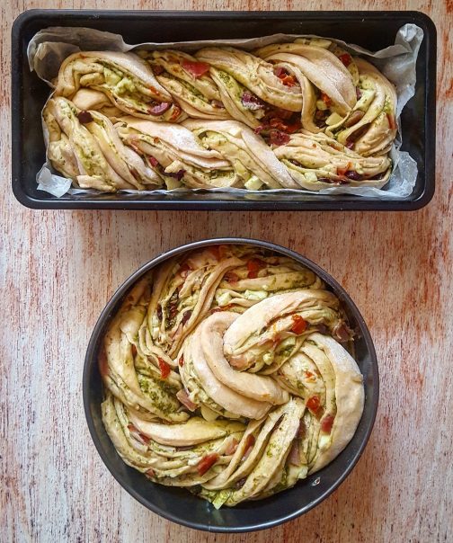 Kad razvučete prvu polovinu testa, premažite ga s 1/2 teglice pesta, stavite ravnomerno pola mocarele, paradajza, maslina i pršute. Sada smotajte rolat (biće dugačak kao njegova duža strana). Uzmite jako štar i tanak nož (idelano onaj za filetiranje) i rolat presecite na pola ali po dužini. Nož mora da bude stvarno oštar jer je važno da imate fin, gladak rez. Dobićete 2 dugačke trake, dužine 50-55 cm. Svaku traku zarotirajte rukama tako da rez bude na gore i napravite pletenicu, tako što ćete preklapati jedan kraj preko drugog.