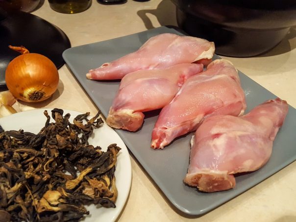 Zečije noge mogu da se nađu smrznute, pa ih jedan dan odmrzavajte u frižideru, a narednog kuvajte. Posolite i pobiberite odmrznutu zečetinu, pa je poređajte u slow-cooker ili đuvečaru/vatrostalnu posudu. Odgovara posuda gde se meso “gušće”naređa, da ne bi morali da sipate previše tečnosti.