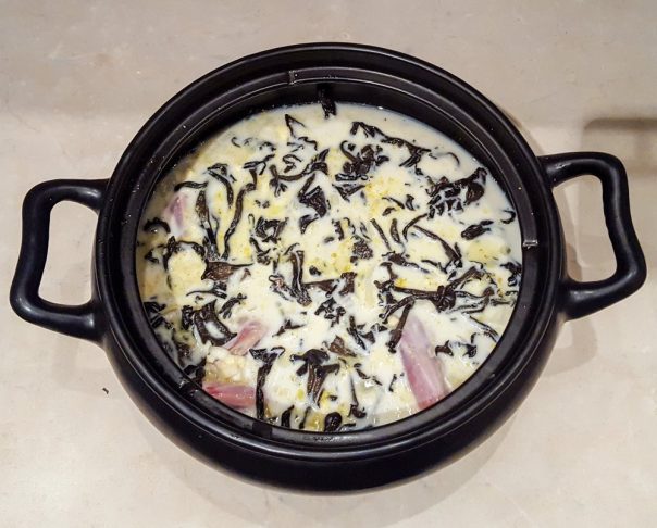 Rehidrirajte crne trube u vodi pa ih dobro isperite (mogu da budu pune peska, tako da ne koristite cediljku za ispiranje). Pospite crne trube preko mesa, sitno nasecite luk, stavite začine, prelijte supom i mlekom – taman za meso bude pokriveno. Dodajte supu ili mleko po želji ako ima potrebe.