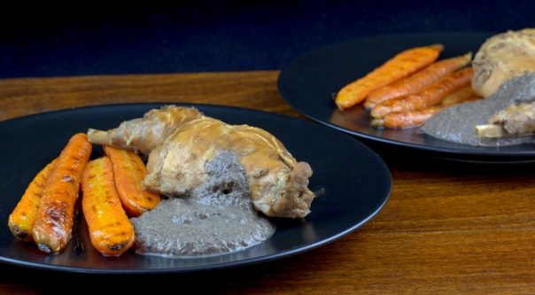 Za prilog: šargerepe presecite na pola po dužini i skuvajte na pari. Potrebno im je oko 20 minuta. Ne treba da budu previše meke. Zatim ih samo kratko prepecite na grill tiganju uz malo maslaca. Ja im nisam stavljala začine, jer je ukus prirodno prelep, slatkast i sjajno ide uz ovo meso. Možda bi se beli biber uklopio, ali so – nikako!